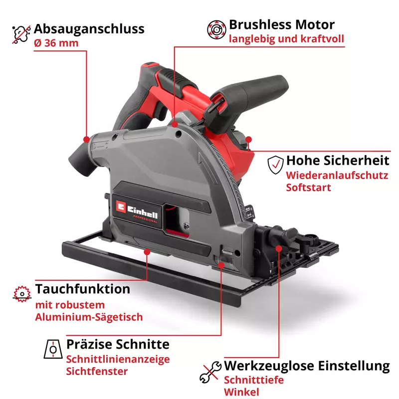 Gegenüber der Handkreissäge: Mit einer normalen Handkreissäge mitten in einer Platte einzutauchen, ist gefährlich und unpräzise (Kickback-Gefahr durch die Pendelhaube). Die Einhell Tauchsäge ist explizit für diesen senkrechten Eintauchvorgang konstruiert und führt das Sägeblatt sicher auf der Schiene abwärts.